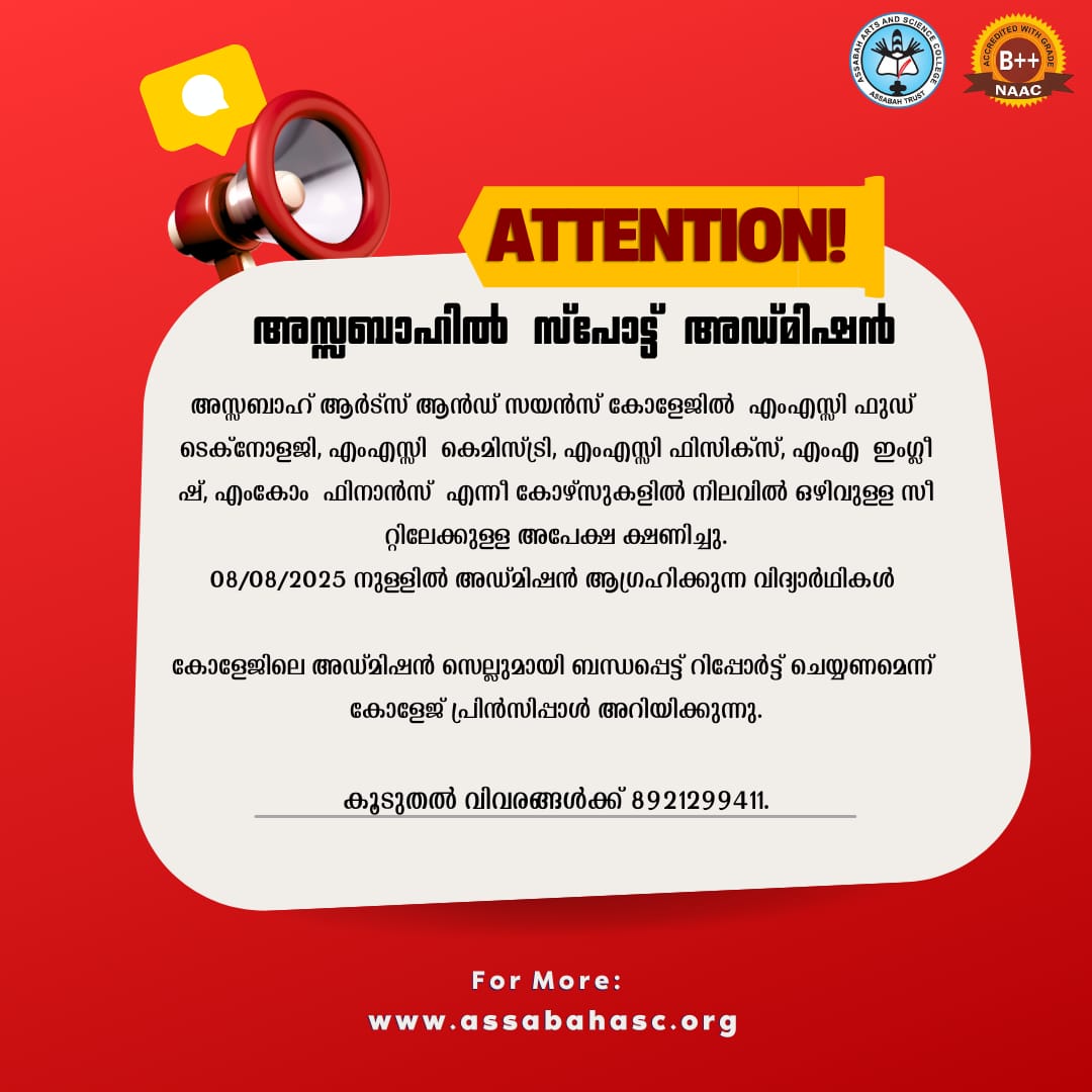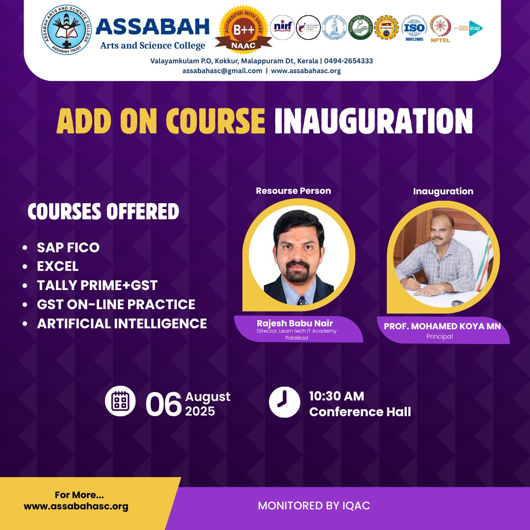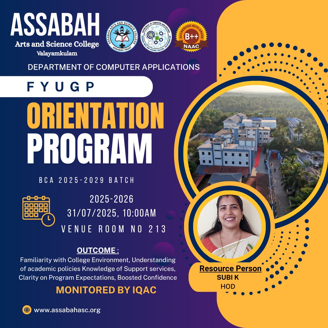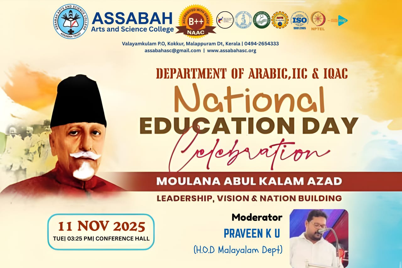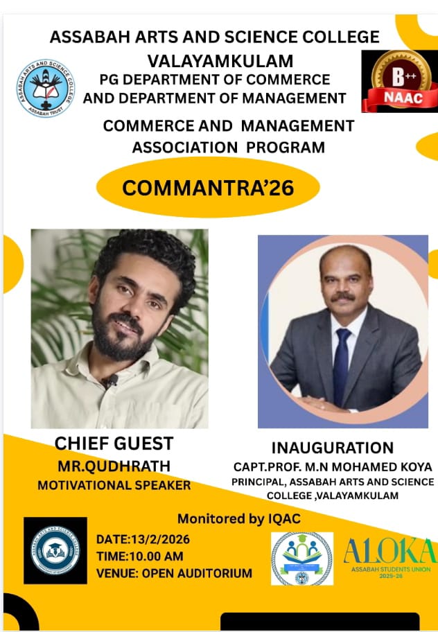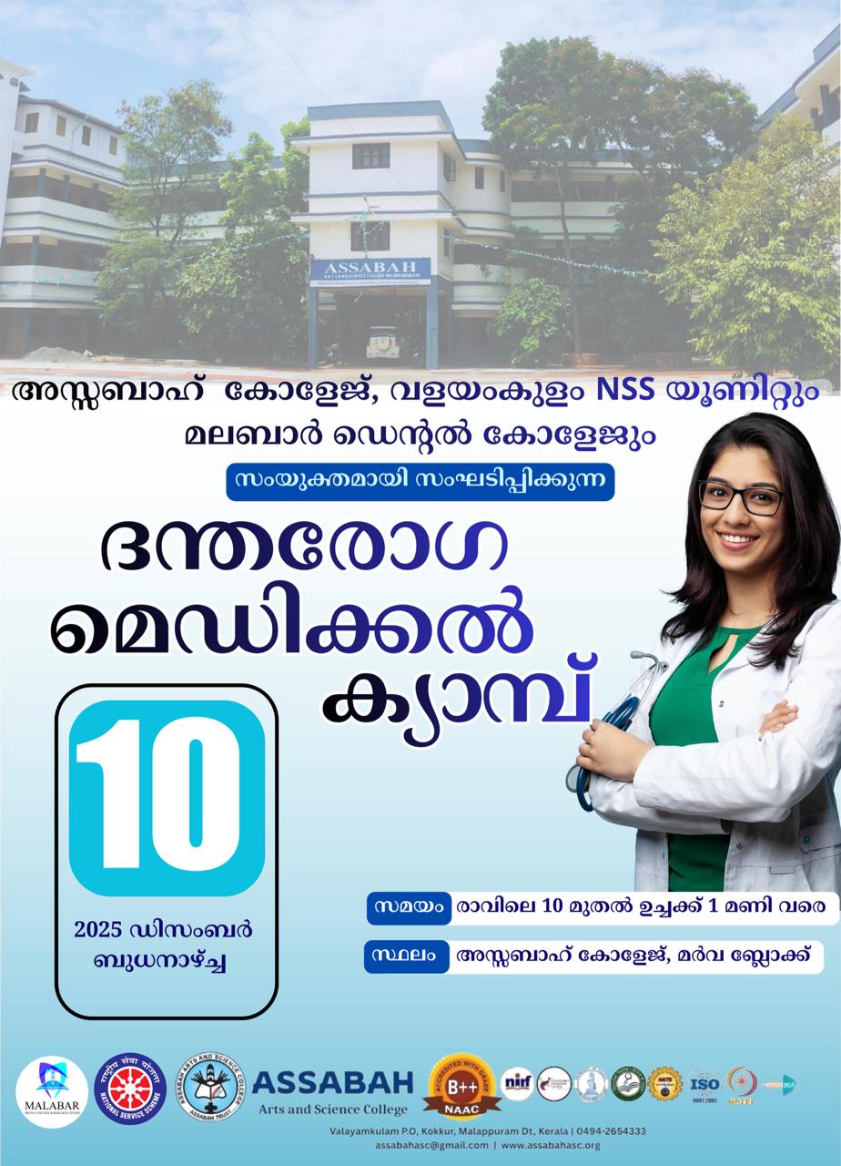 Assabah Arts & Science College,Valayamkulam is a self financing college affiliated to the University of Calicut.The college was established in 2005.The college is run by the Assabah association trust.The other institutions under this management are Assabah Arabic College, Pavittappuram, Assabah Higher secondary school, Pavittappuram, and MVM Residential higher secondary school, Valayamkulam. Assabah Arts &Science college is situated very close to Kuttippuram-Thrissur state highway at Valayamkulam, Kokkur in the Alamcode panchayath, Malappuram district.