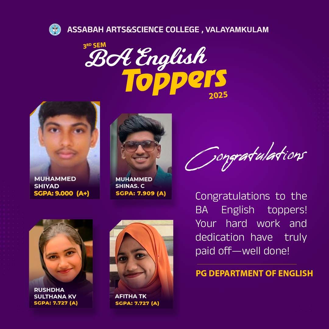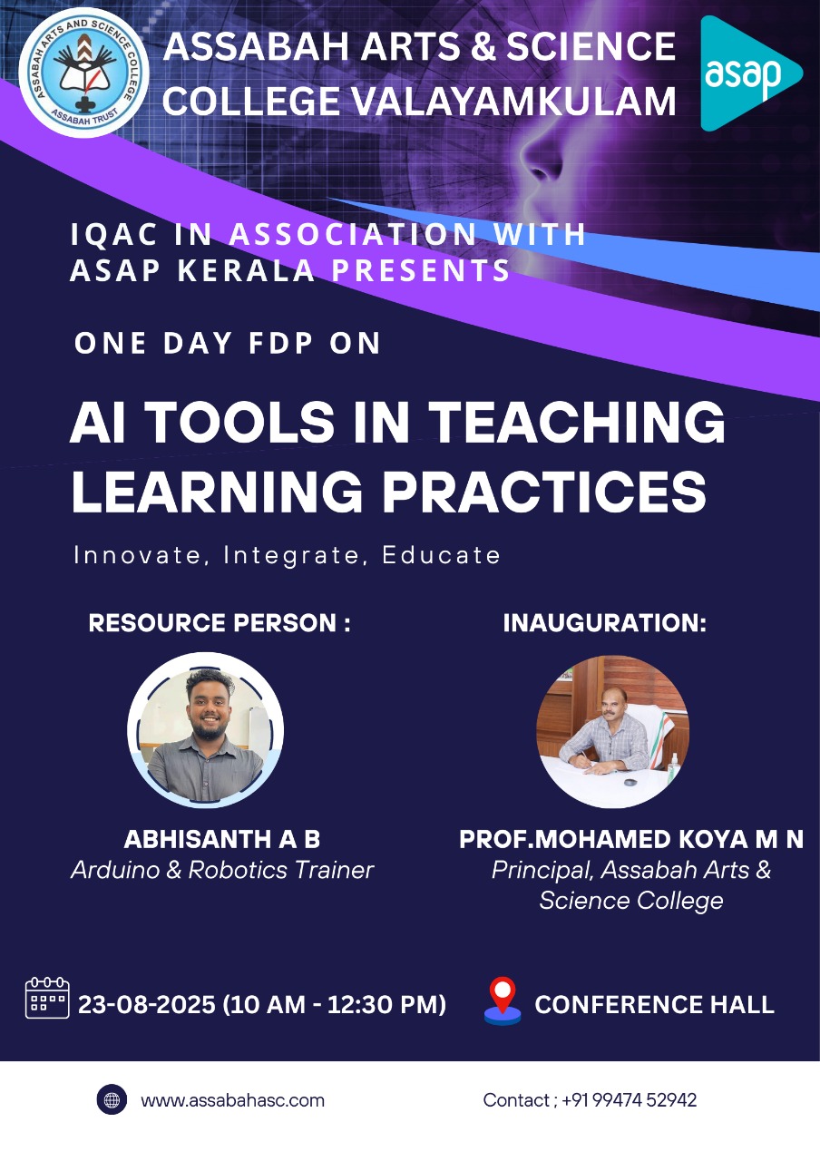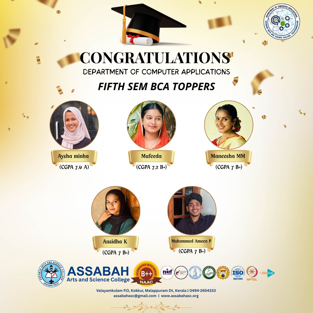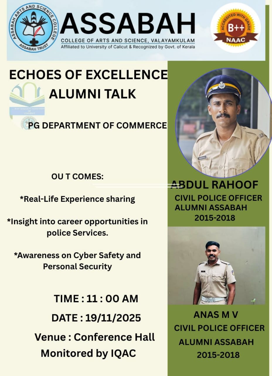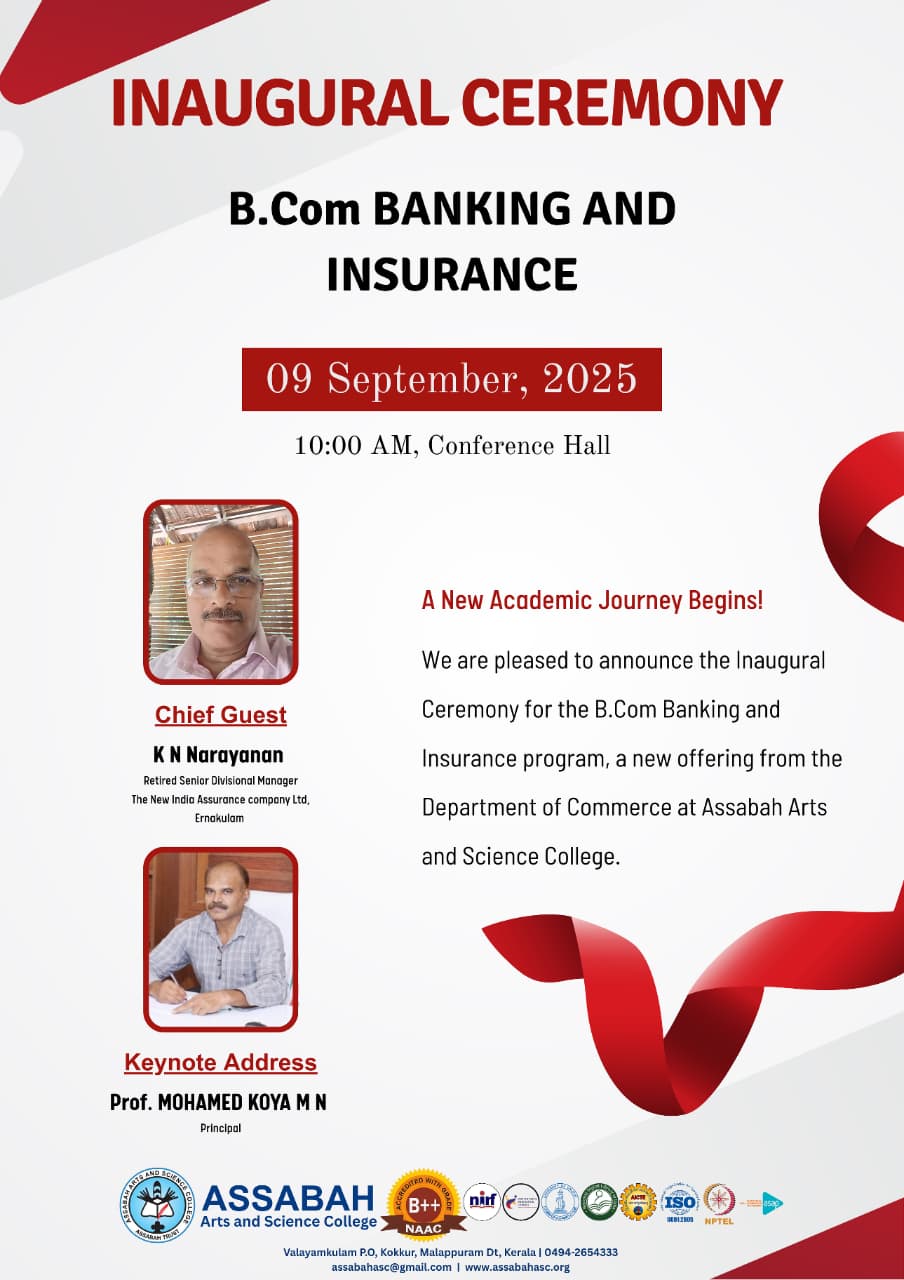 Assabah Arts & Science College,Valayamkulam is a self financing college affiliated to the University of Calicut.The college was established in 2005.The college is run by the Assabah association trust.The other institutions under this management are Assabah Arabic College, Pavittappuram, Assabah Higher secondary school, Pavittappuram, and MVM Residential higher secondary school, Valayamkulam. Assabah Arts &Science college is situated very close to Kuttippuram-Thrissur state highway at Valayamkulam, Kokkur in the Alamcode panchayath, Malappuram district.