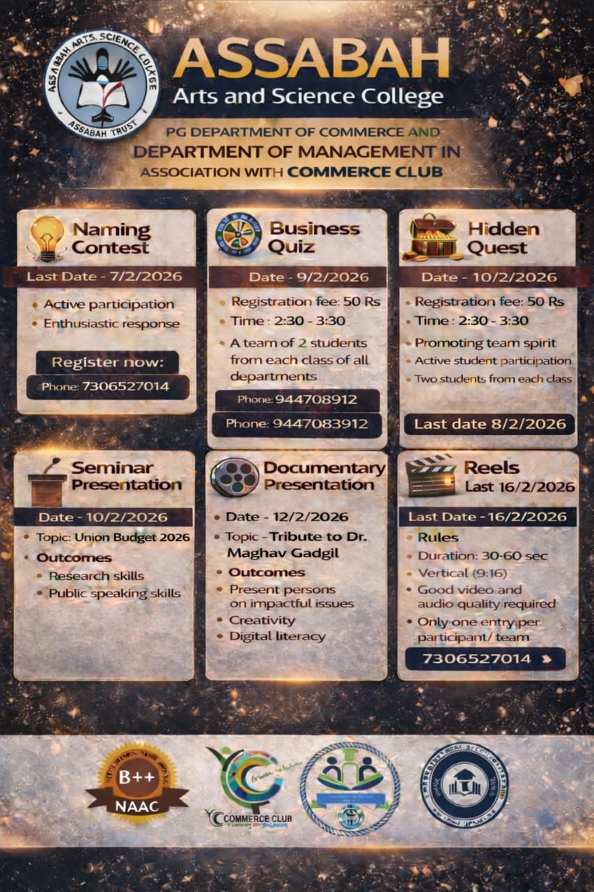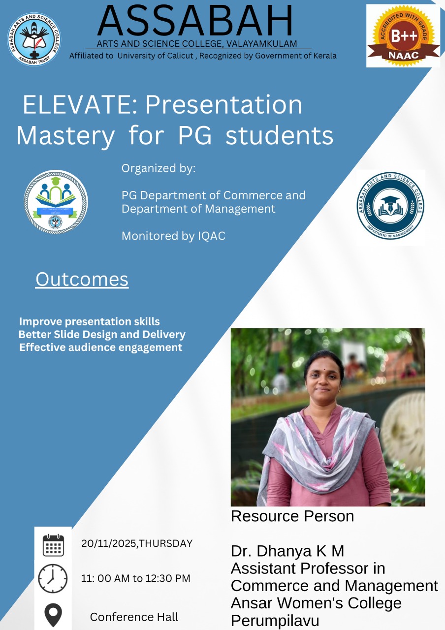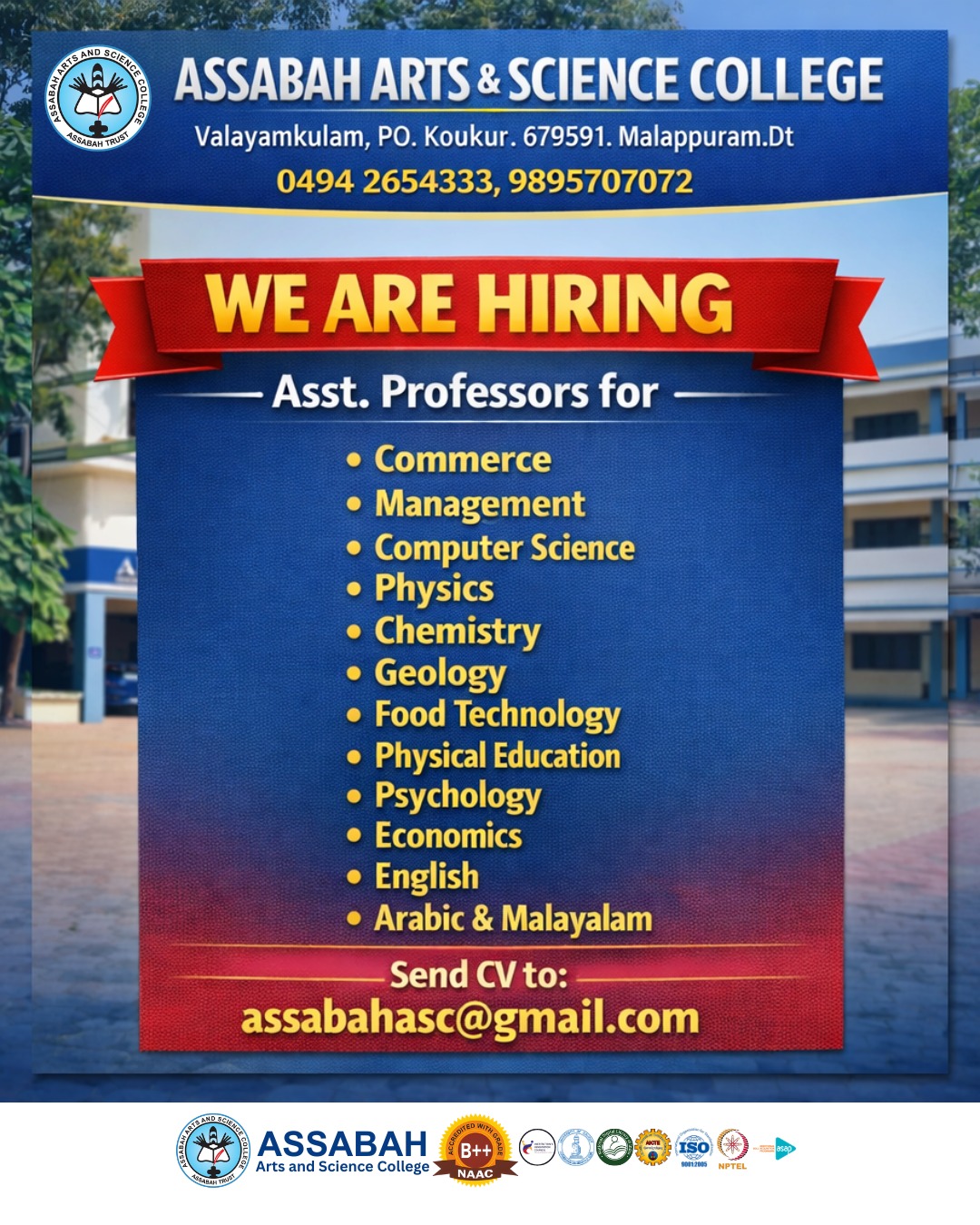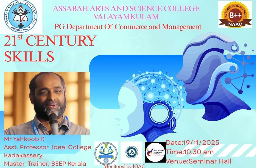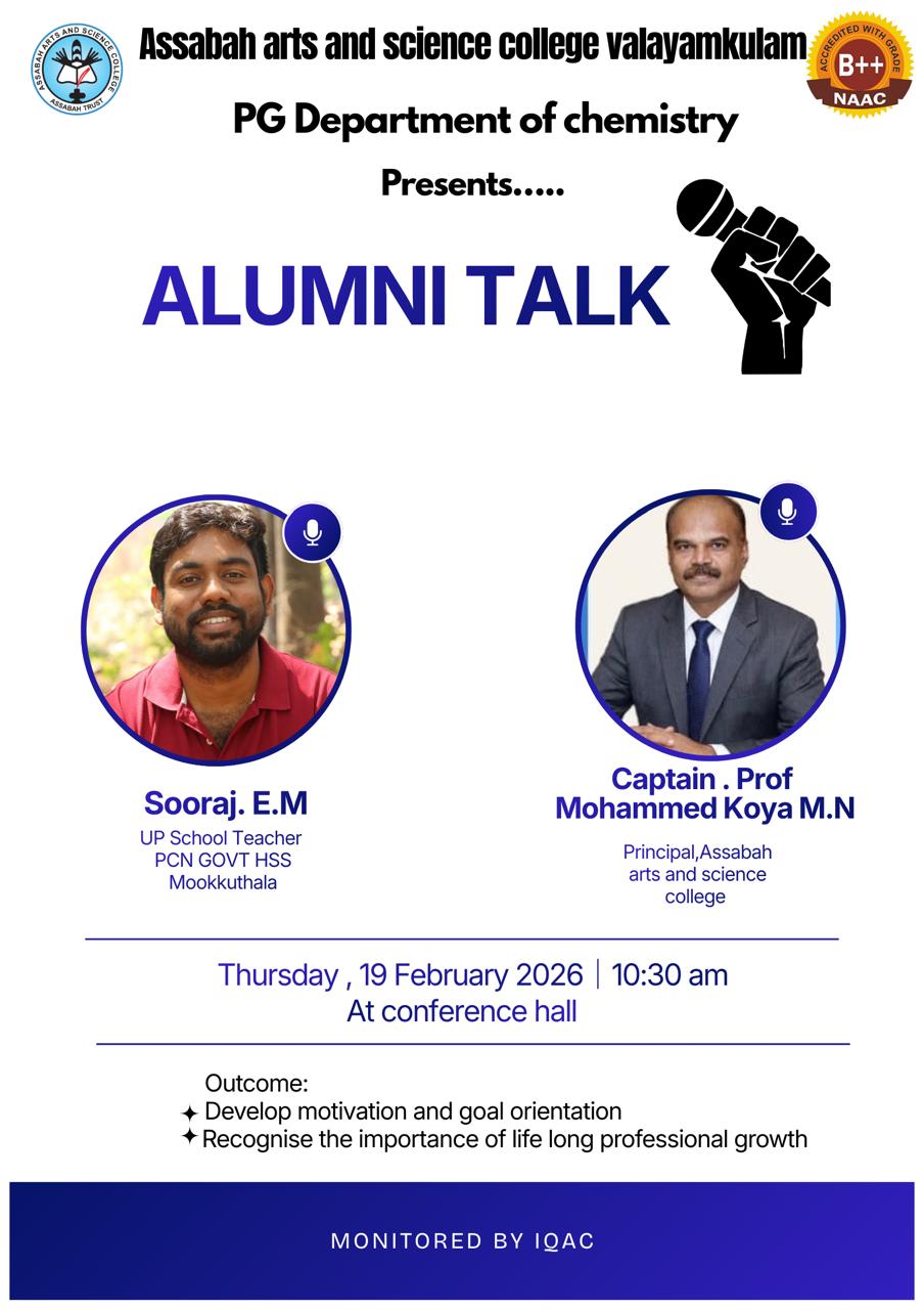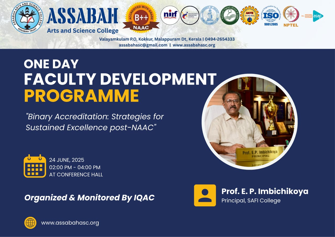 Assabah Arts & Science College,Valayamkulam is a self financing college affiliated to the University of Calicut.The college was established in 2005.The college is run by the Assabah association trust.The other institutions under this management are Assabah Arabic College, Pavittappuram, Assabah Higher secondary school, Pavittappuram, and MVM Residential higher secondary school, Valayamkulam. Assabah Arts &Science college is situated very close to Kuttippuram-Thrissur state highway at Valayamkulam, Kokkur in the Alamcode panchayath, Malappuram district.