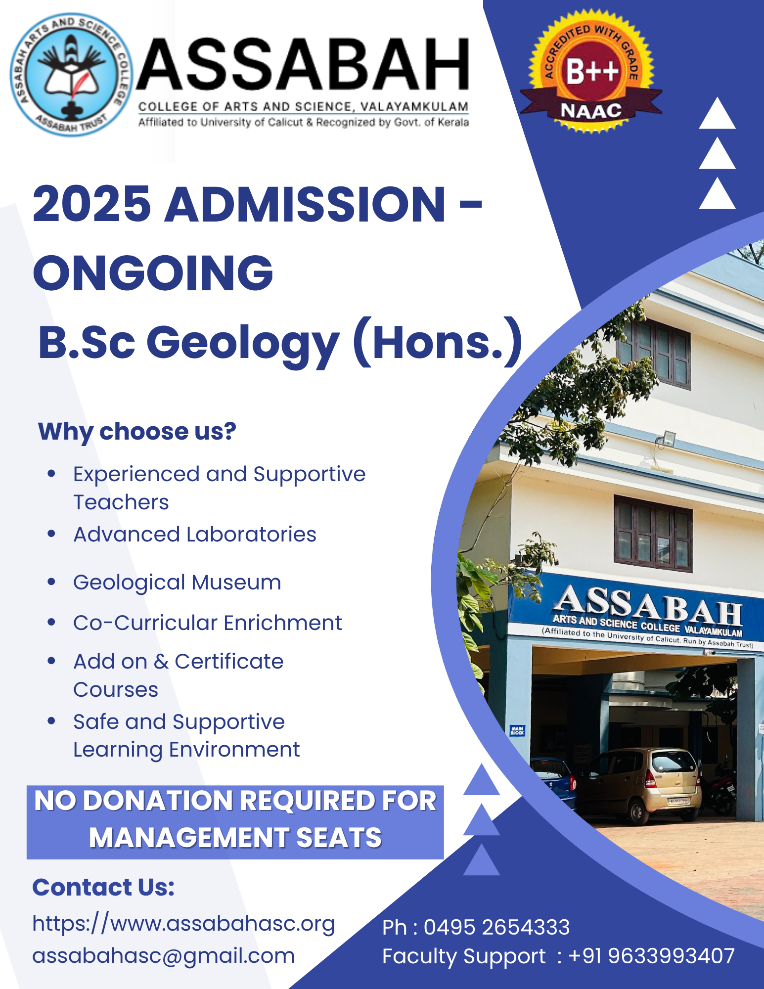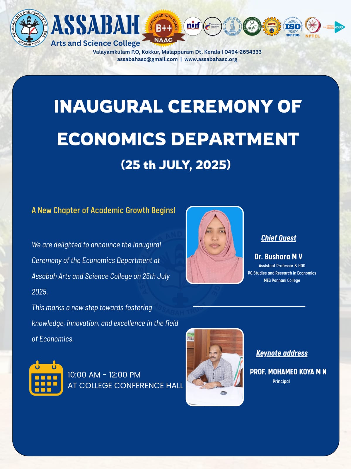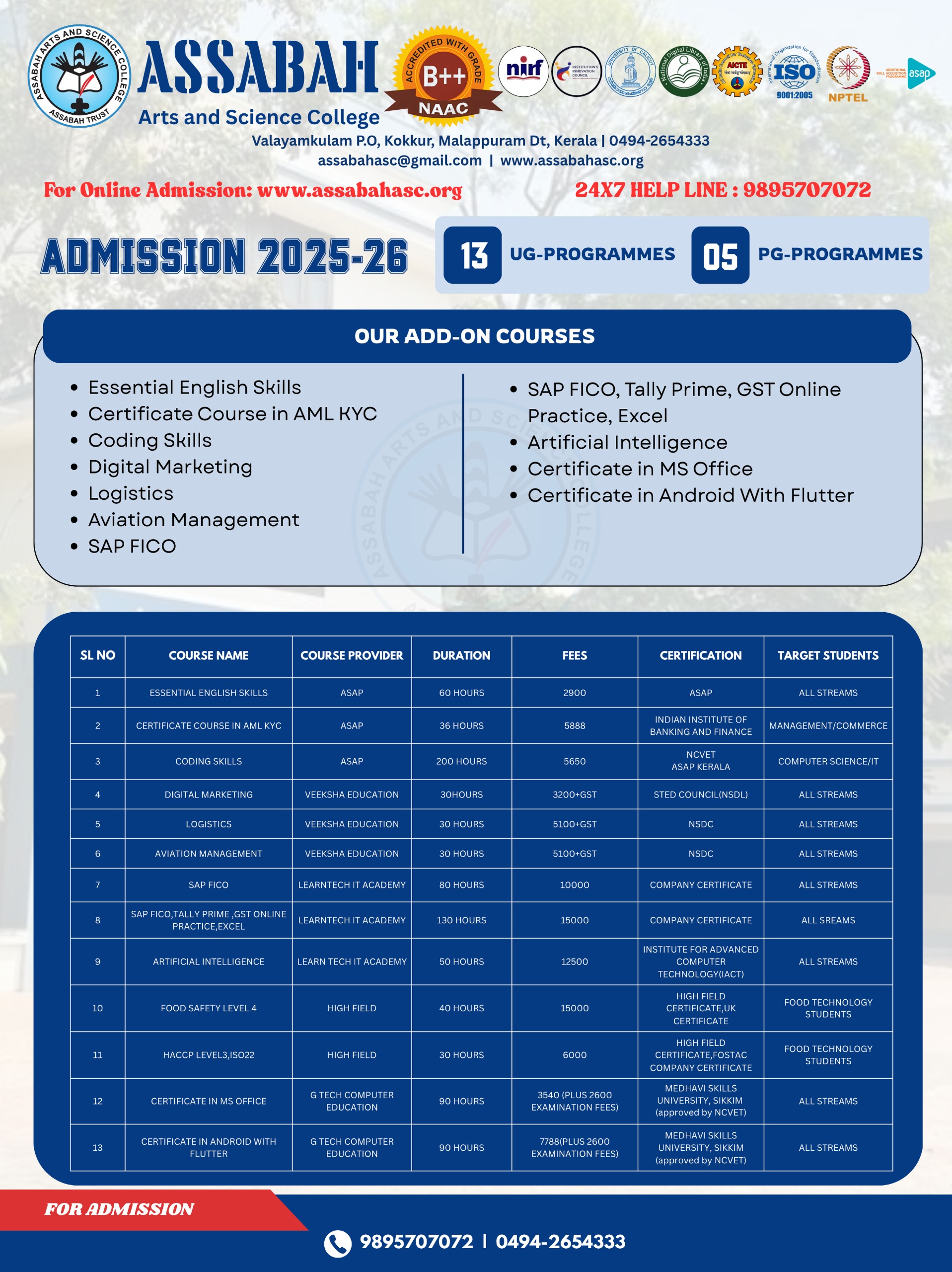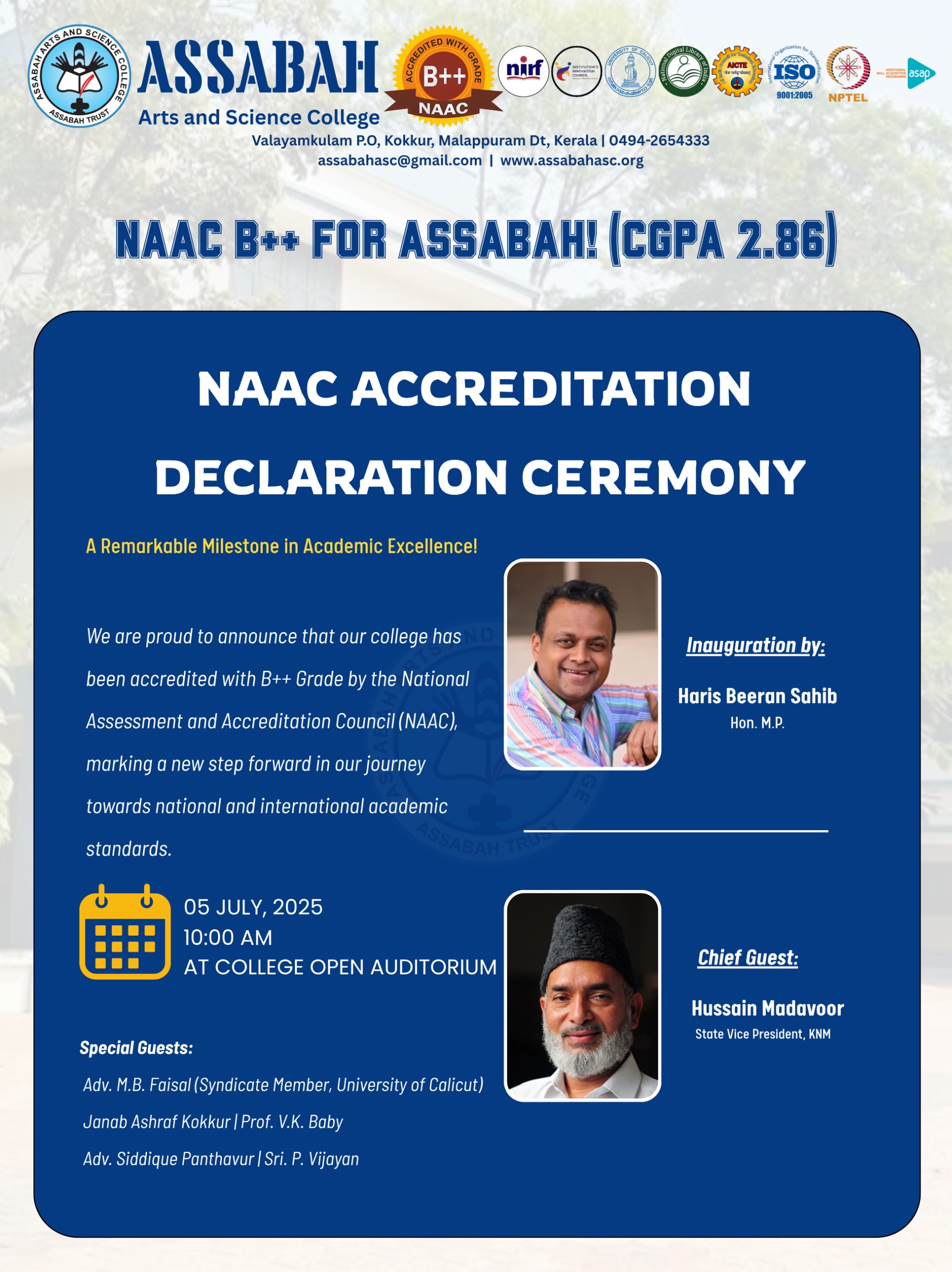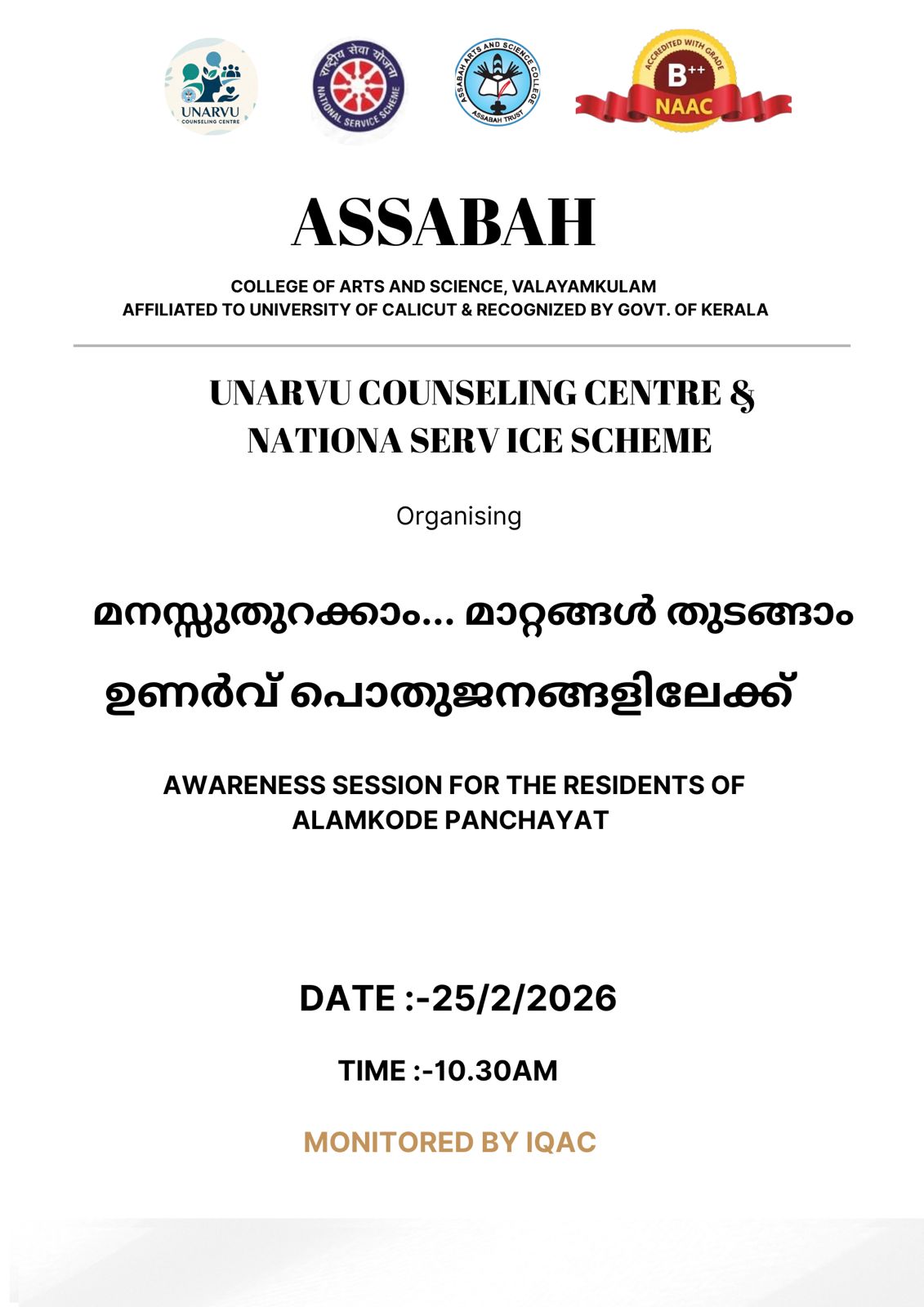 Assabah Arts & Science College,Valayamkulam is a self financing college affiliated to the University of Calicut.The college was established in 2005.The college is run by the Assabah association trust.The other institutions under this management are Assabah Arabic College, Pavittappuram, Assabah Higher secondary school, Pavittappuram, and MVM Residential higher secondary school, Valayamkulam. Assabah Arts &Science college is situated very close to Kuttippuram-Thrissur state highway at Valayamkulam, Kokkur in the Alamcode panchayath, Malappuram district.