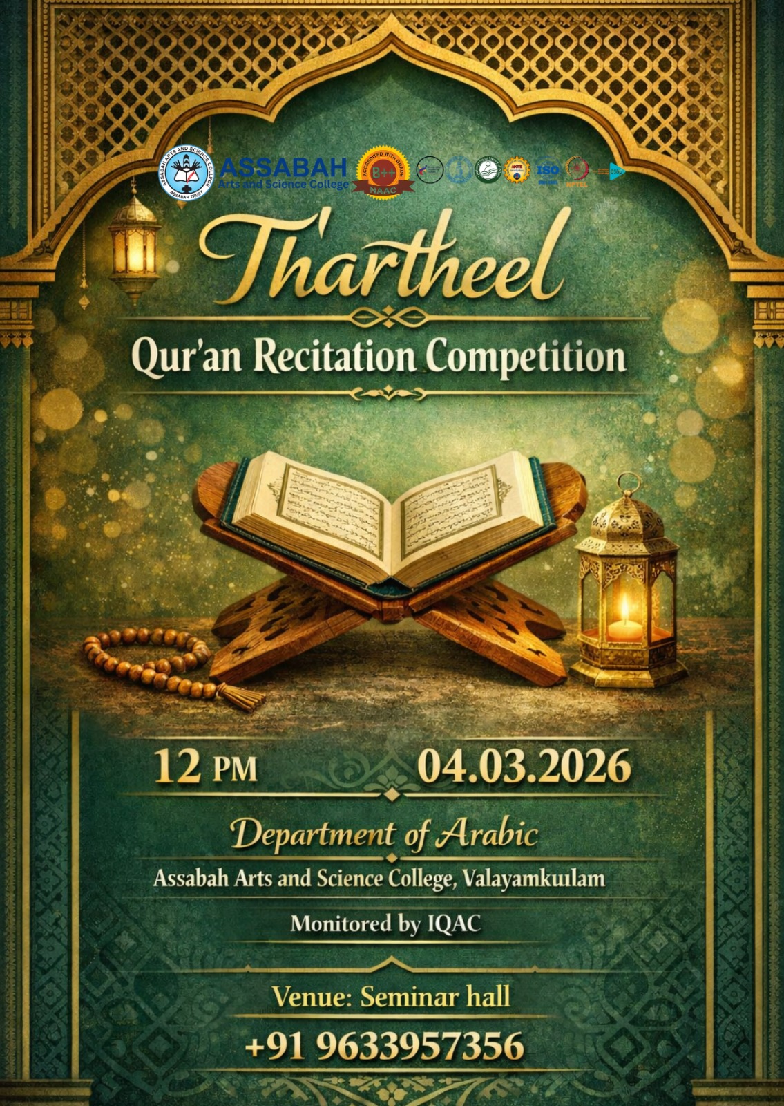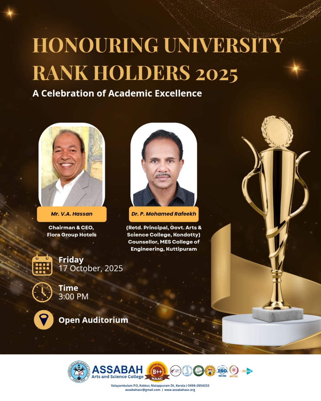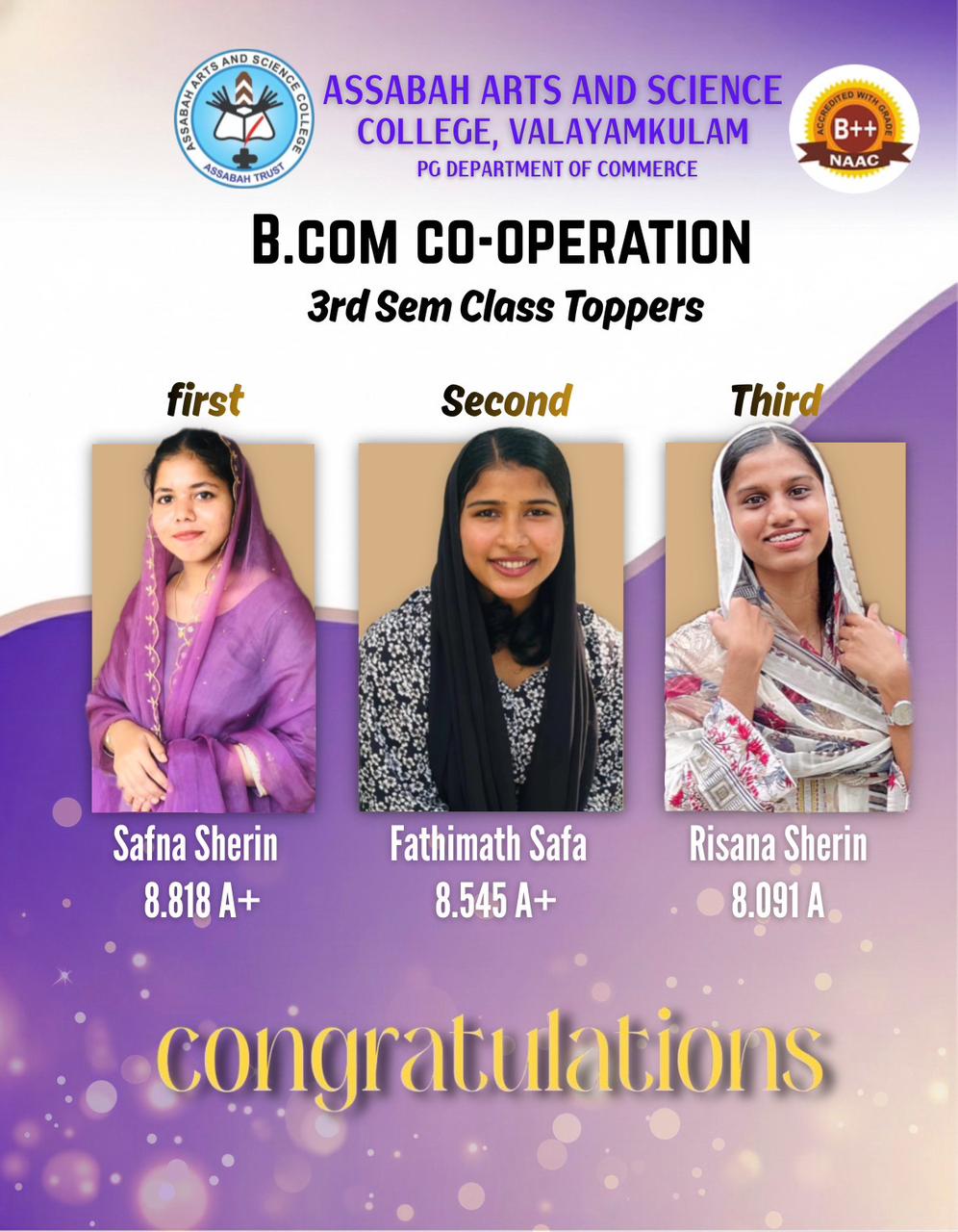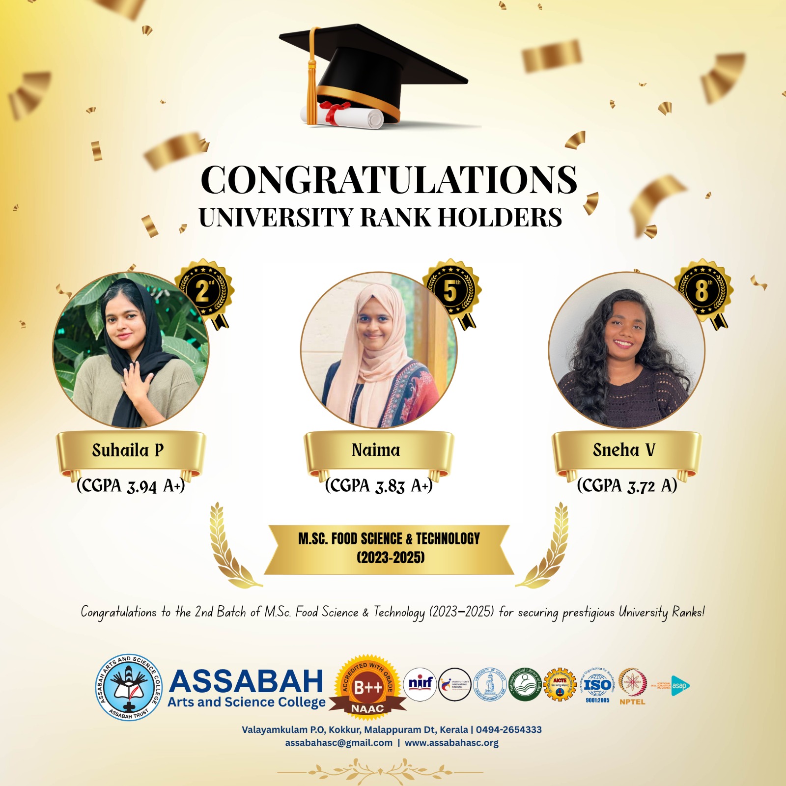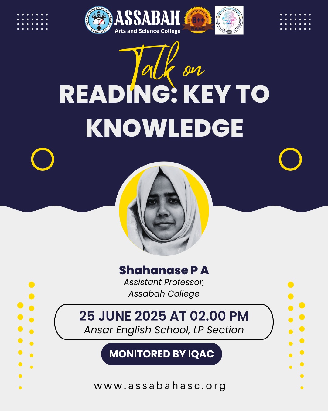 Assabah Arts & Science College,Valayamkulam is a self financing college affiliated to the University of Calicut.The college was established in 2005.The college is run by the Assabah association trust.The other institutions under this management are Assabah Arabic College, Pavittappuram, Assabah Higher secondary school, Pavittappuram, and MVM Residential higher secondary school, Valayamkulam. Assabah Arts &Science college is situated very close to Kuttippuram-Thrissur state highway at Valayamkulam, Kokkur in the Alamcode panchayath, Malappuram district.