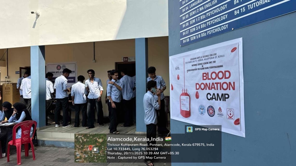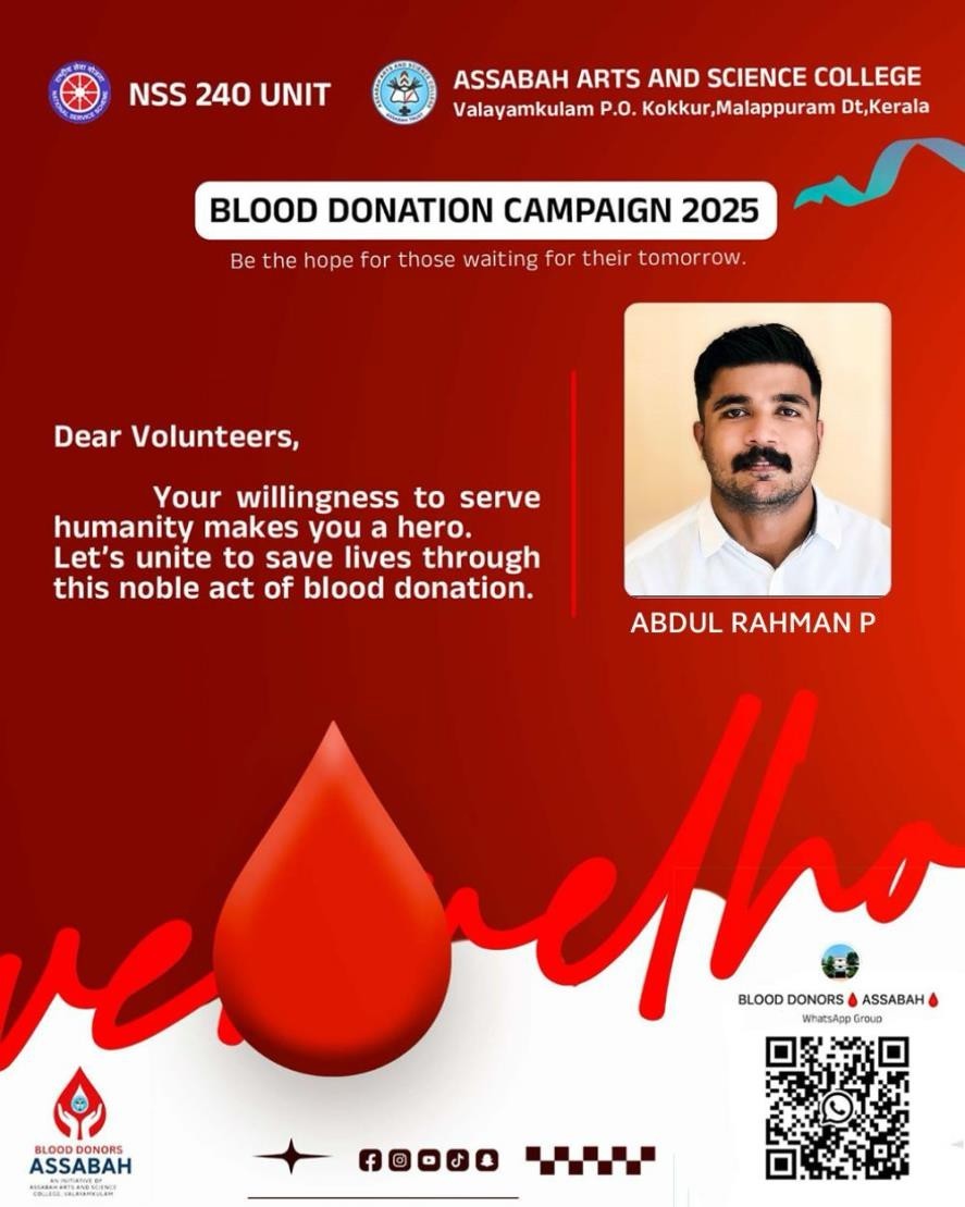 Valayamkulam Assabah Arts and Science College NSS Unit 240, in association with The Blood Bank Perinthalmanna, organized a blood donation camp at the college campus in Changaramkulam. The program was inaugurated by College Principal Muhammed Koya