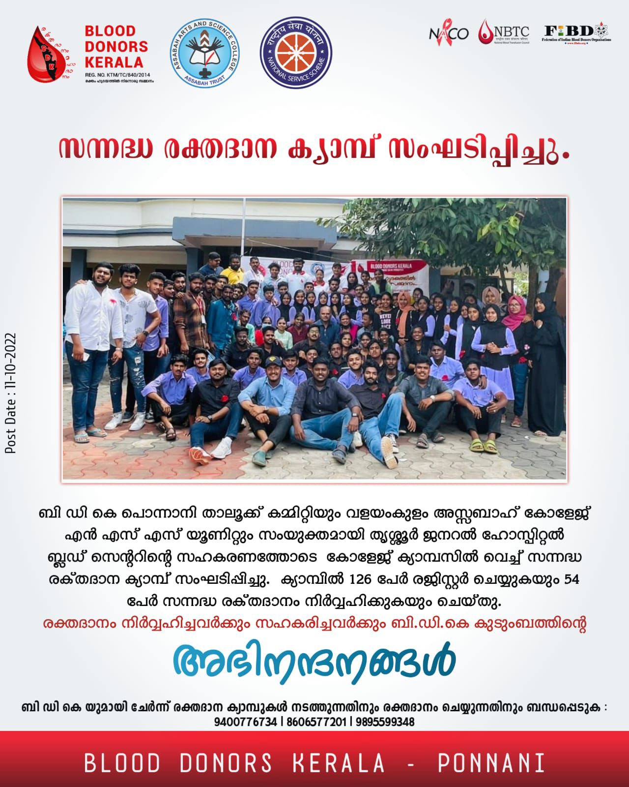 On October 11, 2022, the Red Ribbon Club of Assabah Arts and Science College collaborated with Blood Donors Kerala to host a significant Blood Donation Camp on campus. This event aimed to address the ongoing need for blood donations in healthcare emergencies and underscored the importance of voluntary contributions to save lives. The camp attracted enthusiastic participation from students, faculty, and staff, supported by trained medical professionals who ensured a safe and efficient donation process. This initiative not only promoted awareness about blood donation but also cultivated a sense of community service and solidarity among participants. The Red Ribbon Club's partnership with Blood Donors Kerala exemplified their commitment to public health and humanitarian efforts, making a meaningful impact within the college and the broader community.