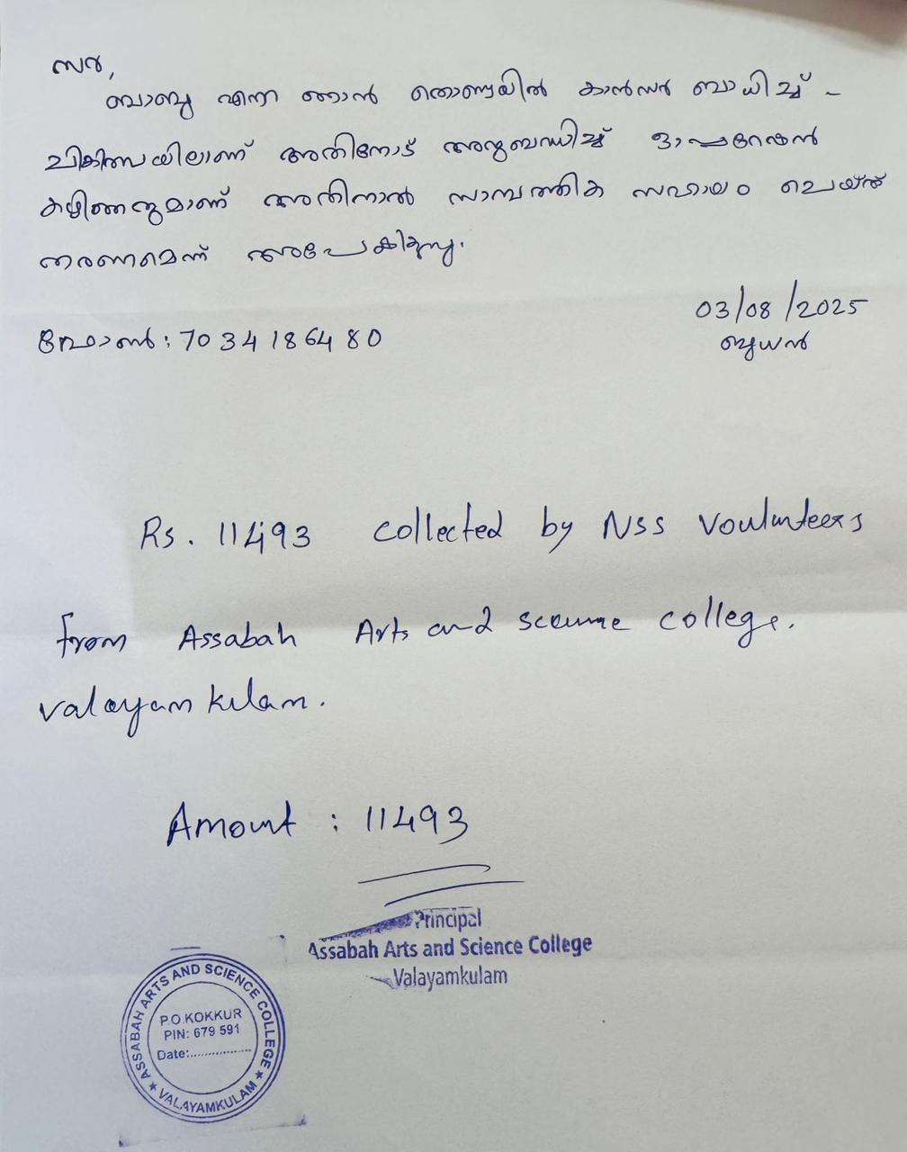The NSS Unit No. 240 of Assabah Arts and Science College, Valayamkulam, organized a humanitarian fundraising initiative on 13 August 2025 to support Mr. Babu, a construction worker from Kuttippuram and Moodal, who has been undergoing treatment for throat cancer for the past few years. Mr. Babu has been regularly visiting the college seeking financial assistance for his medical treatment, and as in previous years, the college community once again came forward to extend their helping hand. On this occasion, Mr. Babu personally visited the college and approached the staff and students for support. Responding compassionately, NSS volunteers initiated a collection drive across various classes under the guidance of Programme Officer Abdul Rahman. P. The teachers and students of all departments showed remarkable generosity and empathy towards his suffering. Through the combined efforts of NSS volunteers, class teachers, and students, a total amount of Rs. 11,493/- was collected and handed over to Mr. Babu on the same day. The NSS unit expressed sincere gratitude to all those who contributed to this noble cause. Further, class teachers were requested to cooperate in collecting additional contributions from students who had informed that they would bring their donations the following day. The event once again demonstrated the spirit of compassion, unity, and social responsibility that defines the NSS movement within the college community. This initiative served as a reminder that small acts of kindness can make a meaningful difference in the lives of those in distress and reflected the NSS motto, “Not Me, But You.”.