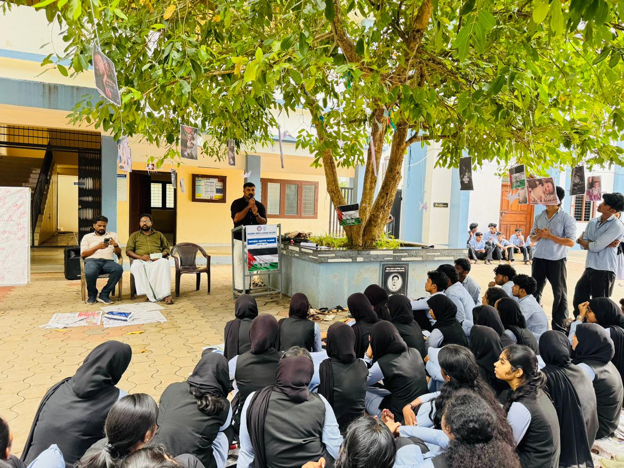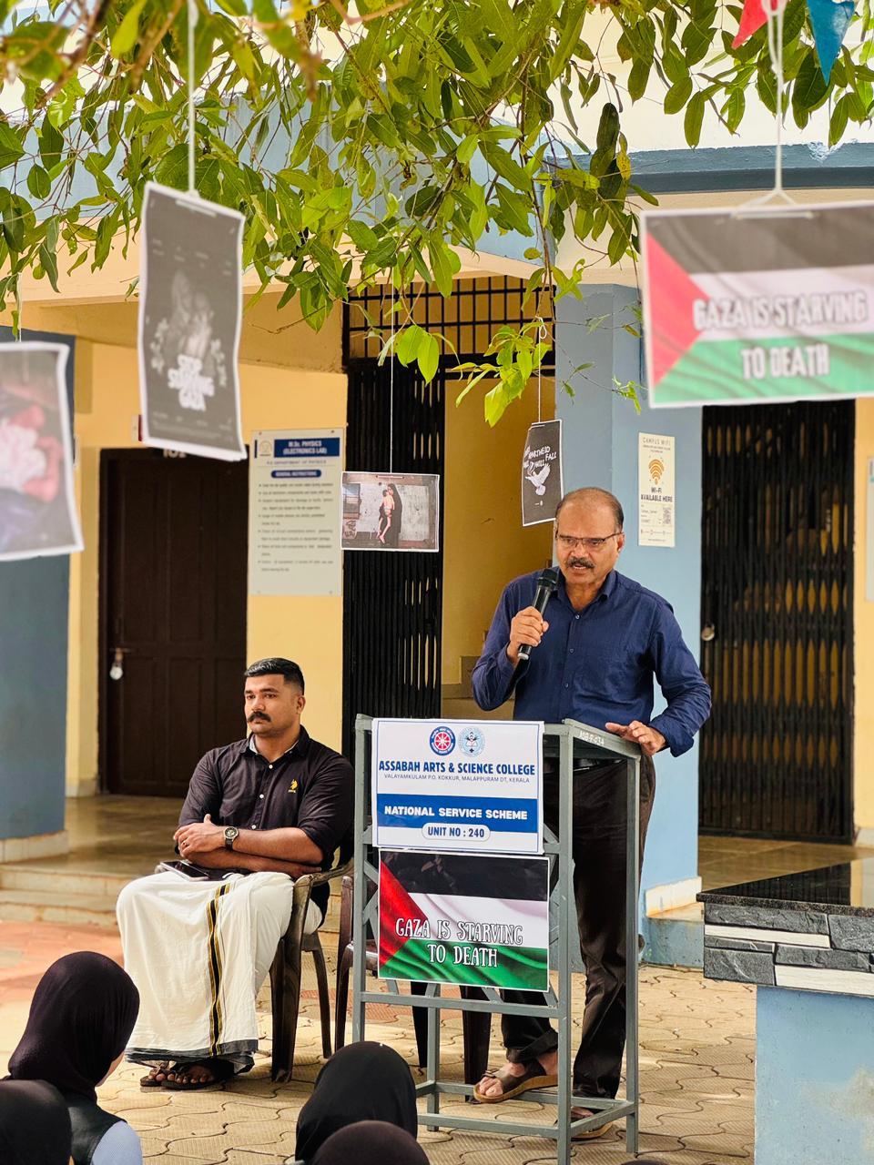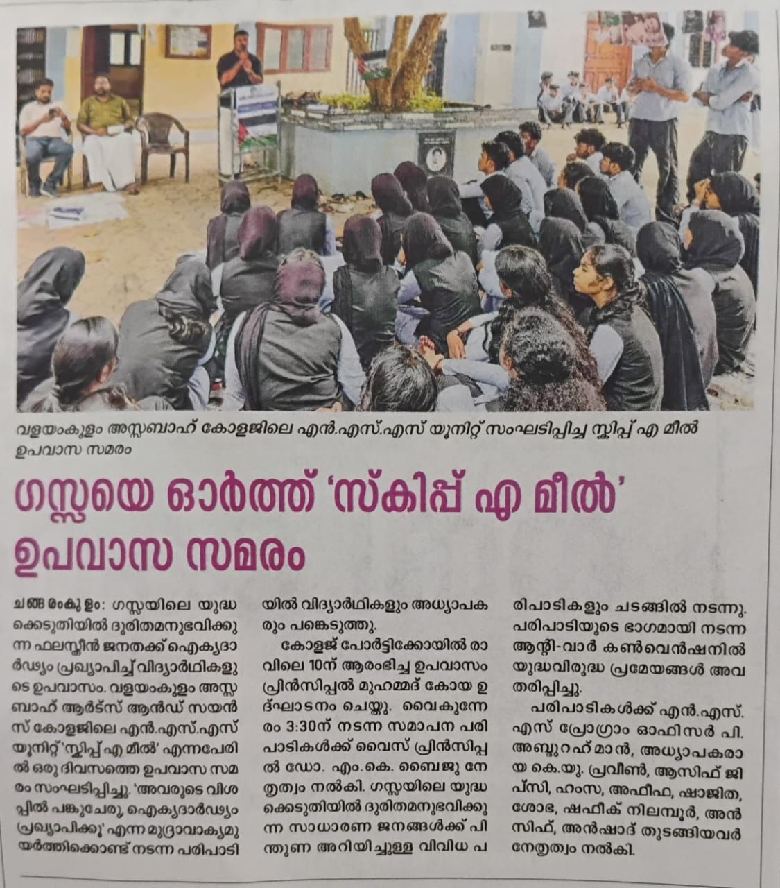 The NSS Unit No. 240 of Assabah Arts and Science College, Valayamkulam, organized a one-day hunger strike titled ‘Skip a Meal’ on 11 Augest 2025 to express solidarity with the Palestinian people enduring immense suffering due to the ongoing war in Gaza. The programme was conducted under the slogan “Share their hunger, express solidarity.” The event began at 10:00 a.m. at the college portico and was formally inaugurated by Principal Muhammad Koya M.N., who addressed the gathering and spoke about the importance of standing with humanity and voicing concern for global peace. The Principal expressed deep sorrow over the hardships faced by the people of Gaza and commended the NSS unit for organizing such a socially meaningful event. Throughout the day, students, teachers, and NSS volunteers actively participated in the hunger strike to symbolically share the suffering of those affected by war. The programme served as a powerful reminder of the value of empathy, peace, and human rights. The closing session, held at 3:30 p.m., was presided over by Vice Principal Dr. Baiju M.K., who appreciated the students’ enthusiasm and moral commitment to humanitarian causes. As part of the day’s events, various activities such as an anti-war convention, speeches, and discussions were organized to raise awareness about the devastating impacts of war. Anti-war resolutions were presented and unanimously adopted during the convention, reflecting the collective stand of the college community against violence and conflict. The event was effectively coordinated under the leadership of NSS Programme Officer Abdul Rahman. P. Faculty members Praveen K.U., Asif Gypsy, Hamza, Afifa, Shajita, Shobha, Shafiq Nilambur, Ansif, Anshad, and others extended their active support in organizing and guiding the students.