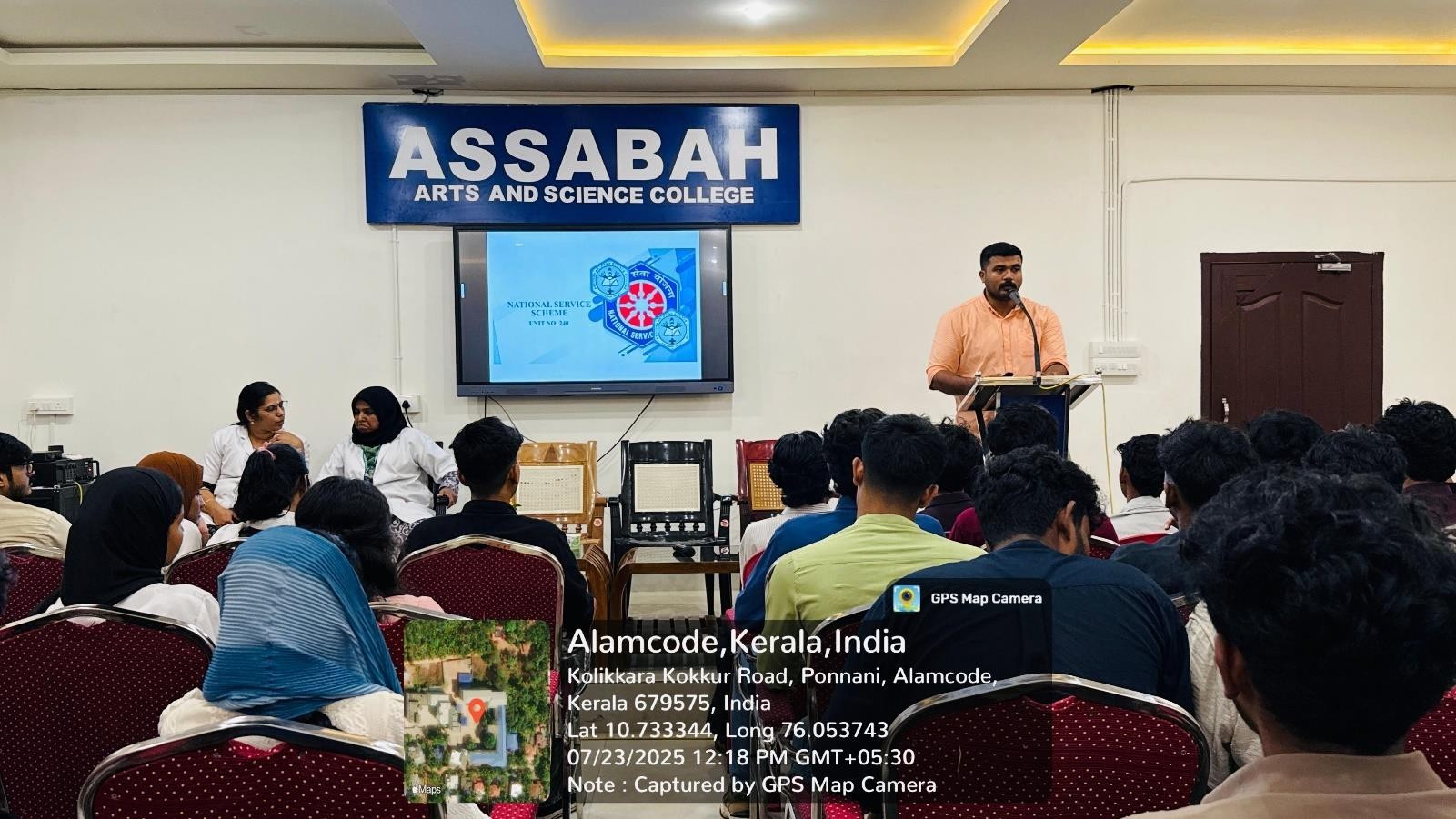 The NSS Unit 240 of Assabah Arts and Science College organized a detailed orientation program for first- year students on July 23, 2025. The session, held at the college auditorium, was designed to introduce the new students to the National Service Scheme and its core principles, as well as to inform them about the activities of the Assabah NSS unit. The orientation was organized by the NSS Program Officer, Abdul Rahman P., and saw an enthusiastic turnout from the new student body.