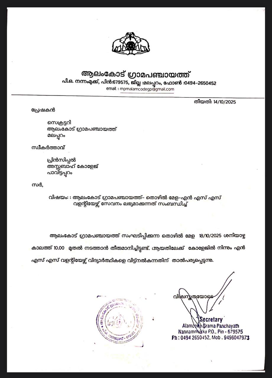 The NSS Unit of Assabah Arts & Science College, Valayamkulam played a key role in volunteering at the “Thozhil Mela – Vijnana Keralam” program organized by Aalamkode Grama Panchayath. The event aimed to promote employment opportunities, skill development, and awareness among youth regarding various government initiatives and scientific advancements. A total of 20 NSS volunteers from the college actively participated in coordinating and supporting the program. Their responsibilities included registration, guidance for participants, stage management, ushering, and maintaining order throughout the event. The volunteers also assisted in the smooth conduct of career guidance sessions, employer interactions, and awareness exhibitions. The commitment, discipline, and teamwork demonstrated by the NSS volunteers were widely appreciated by the organizers and guests. Through this experience, volunteers enhanced their organizational and communication skills while contributing to a socially relevant initiative that bridged youth with opportunities.