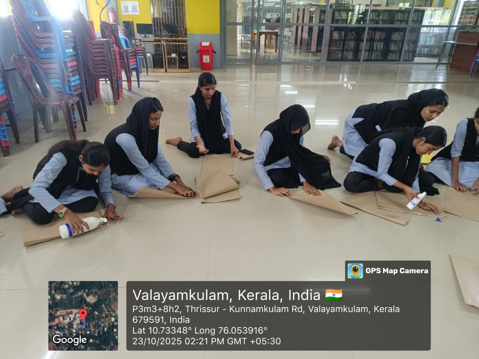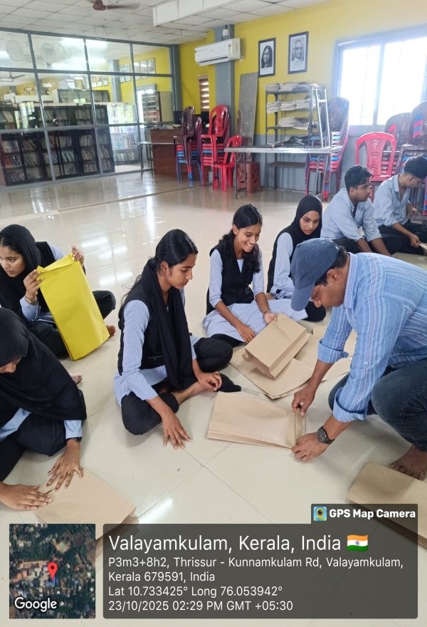 The Entrepreneurship Development (ED) Club of Assabah Arts and Science College, Valayamkulam organized a Paper Bag Making Workshop on 23rd October 2025 at 1:30 PM in the Library Hall. The session was handled by Mr. Musthafa T.V. Fevicryl Expert, who demonstrated various techniques of making paper bags using eco-friendly materials.